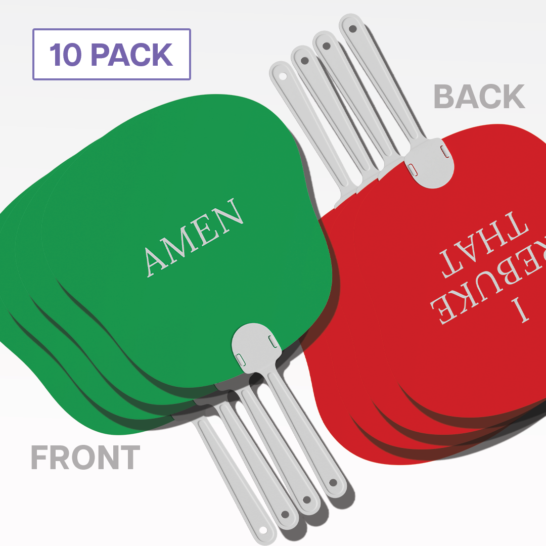 Includes 10 double-sided hand fans with “AMEN” on one side and “I REBUKE THAT” on the other. Each fan is bold, funny, and perfect for expressing yourself while staying cool at any event.
